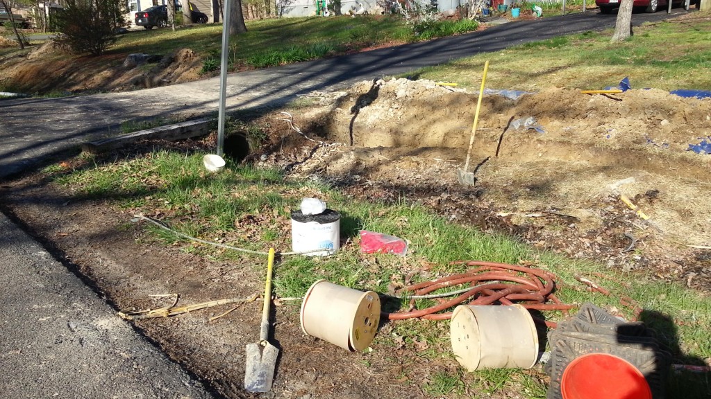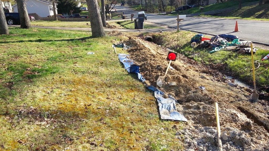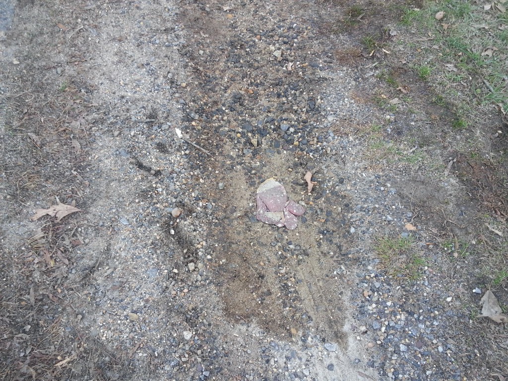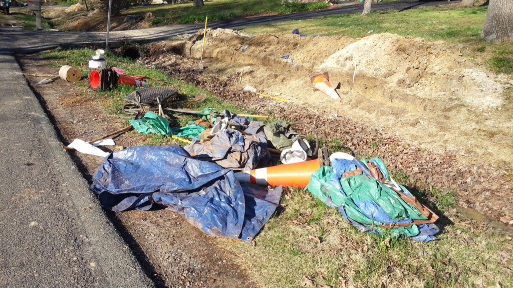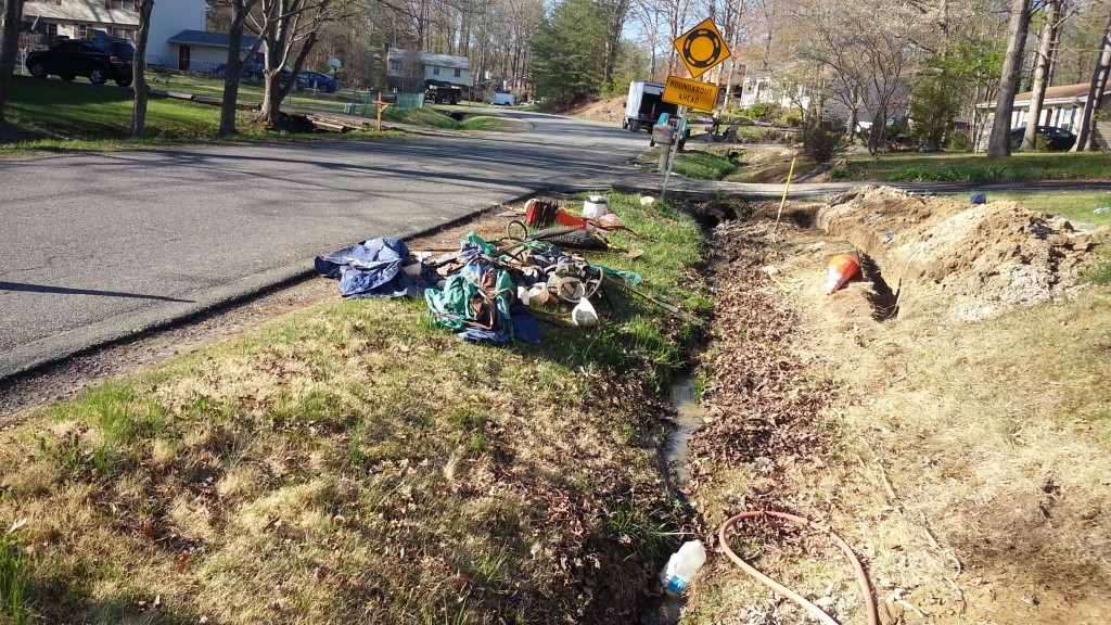 - Taken from driveway looking West towards Green Arbor. Nice mess in the street and jug in the ditch (which they left). Backpack against tree, water bottle behind that (which they left)